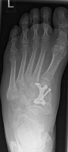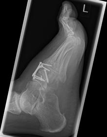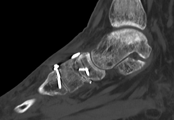 Im Rahmen einer Verlaufskontrolle zeigte sich ein Schraubenbruch als Zeichen einer fehlenden Durchbauung der Arthrodese.