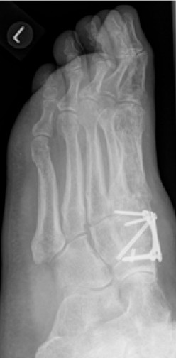 Bei einer Verlaufskontrolle im Juli 2017 ergab sich bei der Röntgenuntersuchung eine Fehllage einer Plattenschraube, die damit das TMT 2 überbrückte.